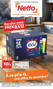 Cette semaine (semaine 4), il y a ⭐️ une promo 1664 chez Netto. ⭐️ L'offre 1664 est au prix de 10,68 € chez Netto dans le catalogue "Rendez-vous PRIX BAS !". Cette offre est valable jusqu'au 02/02/2026. Consultez en ligne le catalogue "Rendez-vous PRIX BAS !" de Netto à la page 1 pour retrouver l'offre 1664. Retrouvez toutes les offres 1664 sur notre page dédiée aux promos 1664.